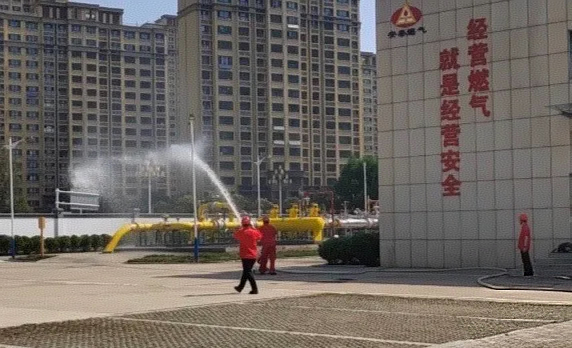 演練指令突然下達后,公司兩站與泰安老街商業(yè)片區(qū)先后“拉響警報”。兩站現(xiàn)場,值班人員發(fā)現(xiàn)“燃氣大量泄漏”后,立刻完成人員疏散和信息上報,調(diào)度室隨即啟動Ⅰ級響應實施遠程關(guān)閥,站區(qū)值班人員對進站閥門井內(nèi)主控閥門進行關(guān)閉。隨后值班人員佩戴正壓式呼吸器、手持檢測儀,迅速鎖定泄漏點,立即啟用消防水帶對泄漏區(qū)域燃氣進行噴淋稀釋,全過程一氣呵成,毫無拖沓。