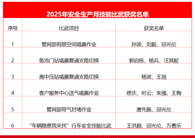 公司圍繞行車安全與燃?xì)馍a(chǎn)運營,開展多樣化比武活動。生產(chǎn)運營方面,管網(wǎng)部、魚池門站、高中壓站及客戶服務(wù)中心分別開展了閥門井有限空間作業(yè)、支路切換、送氣安全操作唱票、封堵作業(yè)等比武活動,以實戰(zhàn)化強化“唱票復(fù)誦”機制,切實提升一線人員規(guī)范操作水平。后勤保障方面,通過舉辦“車輛隱患我來找”行車安全技能比武,將安全規(guī)范融入操作細(xì)節(jié),讓應(yīng)急能力在競技中淬煉升華。